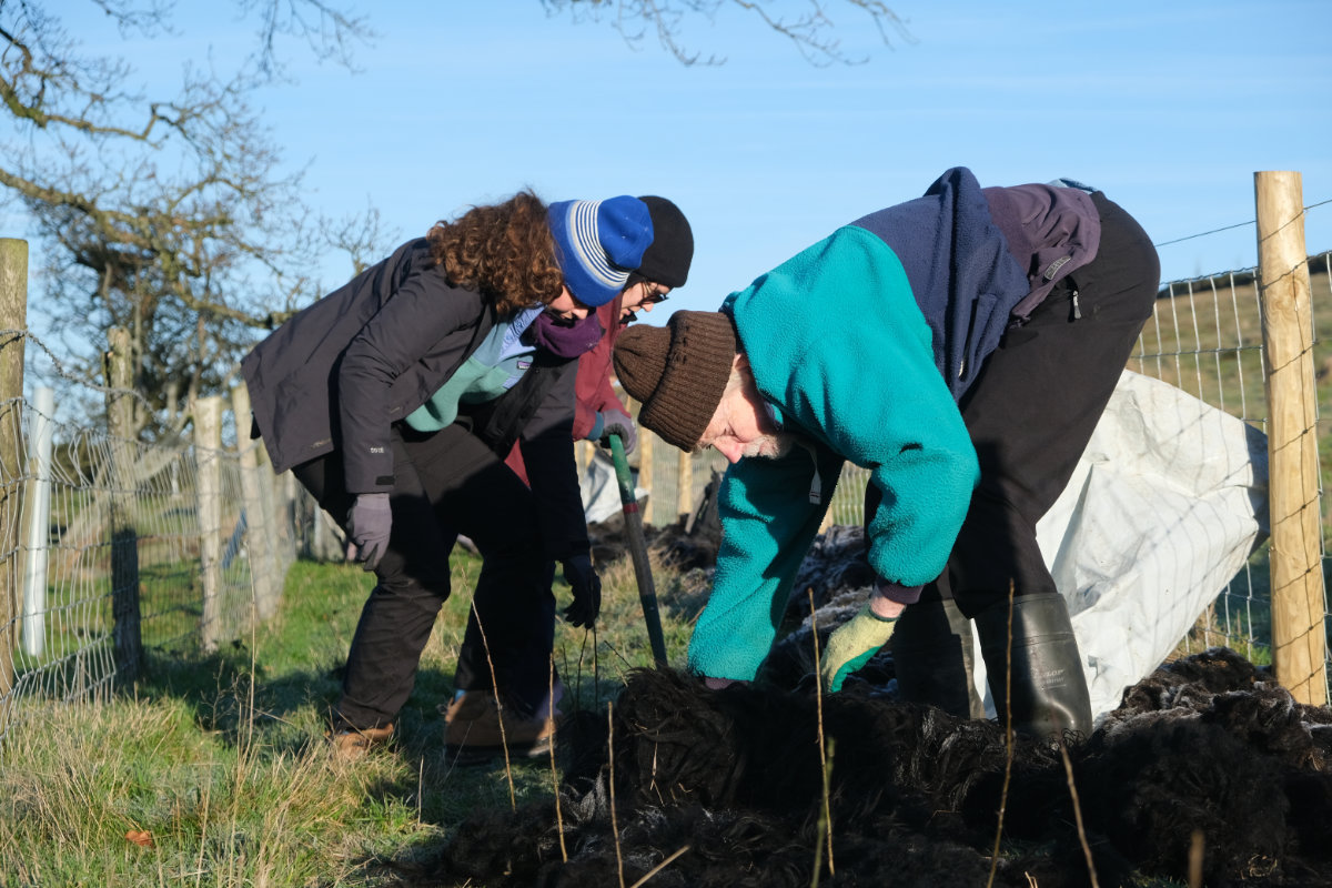 (Photos (c) Sarah Jameson. Above: Weir Farm, New Invention – hedge newly-laid with snow; Below: volunteers adding fleeces (from the landowner’s own sheep) to the whips as mulch to aid moisture retention on an upland site on the side of the Stiperstones)